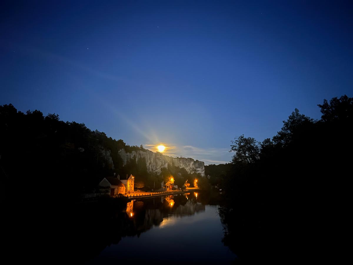 We were blessed again with magnificent autumn light and the sight of a vast Harvest Moon rising spectacularly over the canal. It was particularly dramatic above the Roches des Saussois, which the Luciole had cruised beneath earlier in the day.